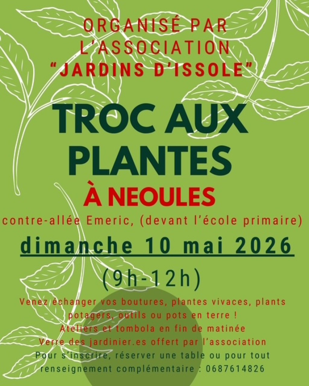 “ Venez échanger vos boutures, plantes vivaces, plants potagers, outils et pot en terre Atelier et tombola en fin de matinée Verre du jardinier offert par l'association ”