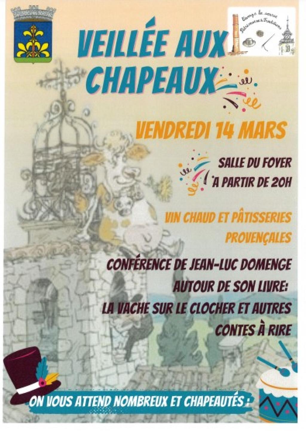 “ Vin chaud et pâtisseries provençales, suivis d’une conférence captivante de Jean-Luc Domenge autour de son livre La Vache sur le Clocher et autres contes à rire. N’oubliez pas votre couvre-chef, on vous attend nombreux… et chapeautés ! ”