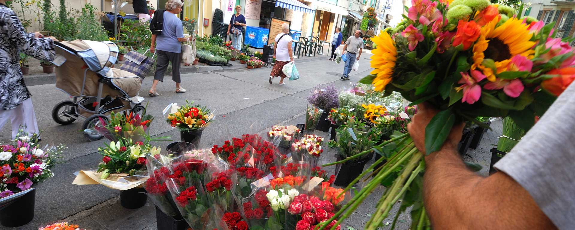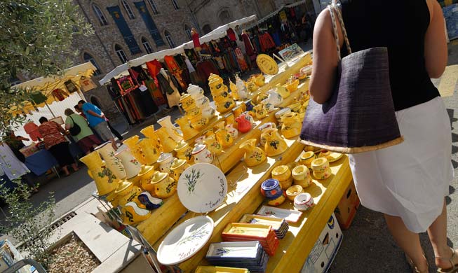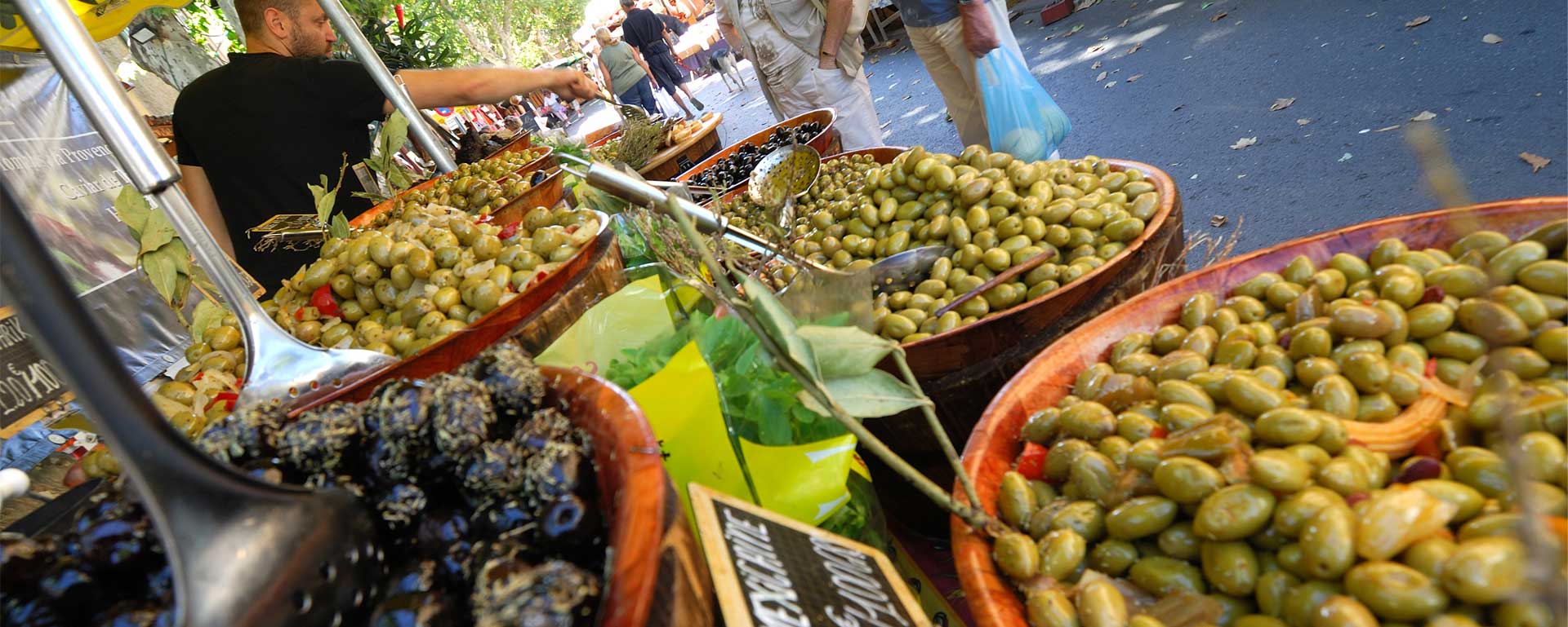 Les marchés provençaux permettent de découvrir les fruits, légumes et plats provençaux : aïoli, bouillabaisse, tapenade, fougasse, fromage de chêvre, miel...