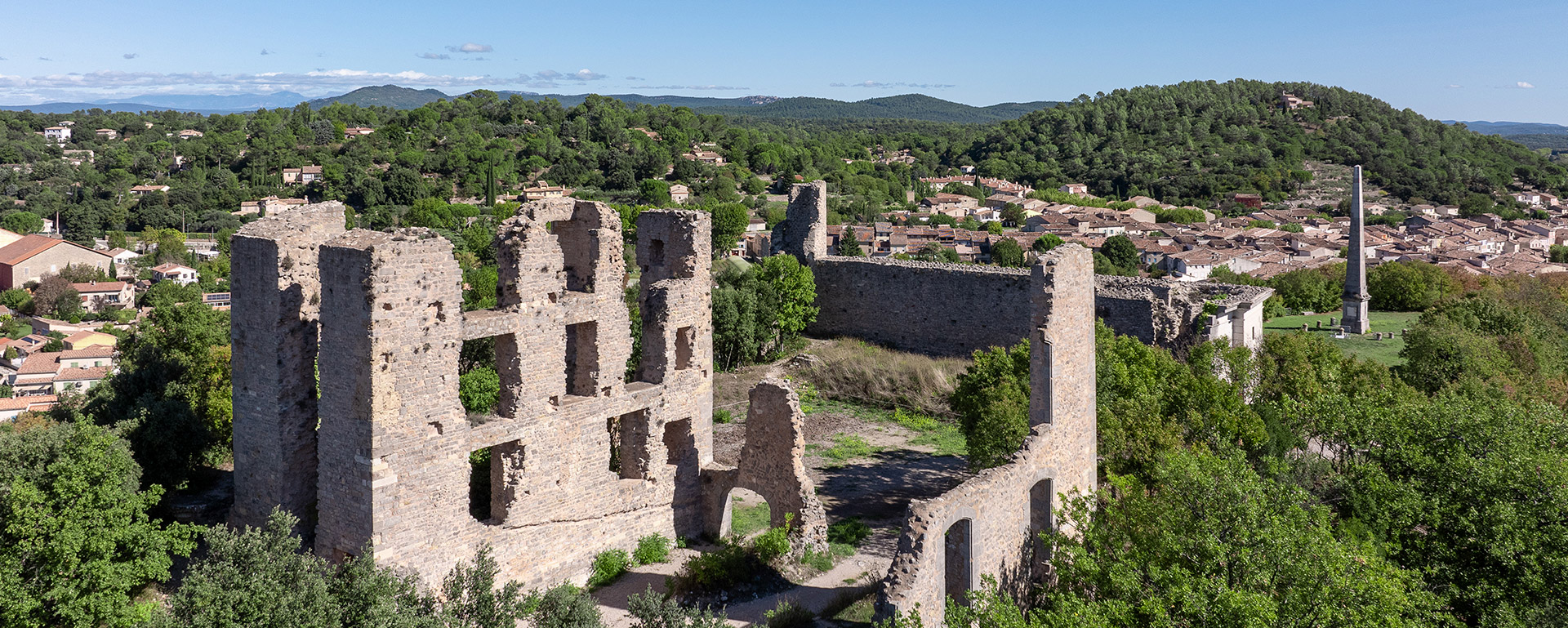 Propriété des Pontevès, famille puissante du sud de la France qui détenaient plusieurs châteaux féodaux, le château évoqué comme Castellum dès 1201 était alors le chef-lieu d’une puissante seigneurie dont dépendait la ville de Barjols. À la fin du XIIème siècle, le village est protégé par une enceinte qui s’ajoute à la forteresse du château. En 1650, son nouveau propriétaire, Pierre de Maurel, surnommé le Crésus de Provence, achète le château et entreprend alors de nombreux travaux de rénovation et d’agrandissement : une cinquantaine de pièces, quatre tours d’angle, des terrasses et à l’intérieur, un riche mobilier jusqu’à un trompe-l’œil du peintre Jean Daret. Aujourd’hui, parmi les vestiges de ce château vieux de plusieurs siècles encore debout, les visiteurs peuvent imaginer les tours, remparts et portes. Situé sur une éminence rocheuse qui surplombe la plaine, profitez de la vue pour distinguer le Petit du Grand Bessillon.