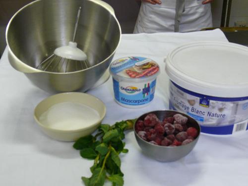 2. Mélanger le sucre et les jaunes ensemble ; rajouter le mascarpone et le fromage blanc.