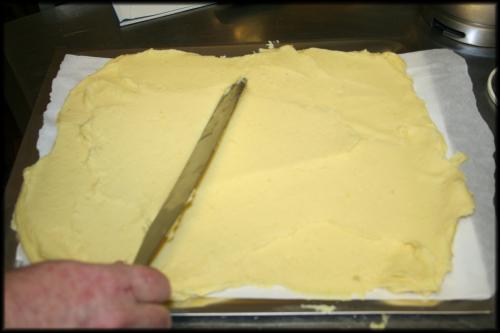 5. Etaler l'appareil sur une plaque à pâtisserie sur une épaisseur de 1 cm et laisser refroidir au réfrigérateur.