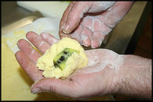 1. Une fois refroidie, découper des carrés de 6 cm. Prendre un carré de préparation dans le creux de la main et poser dessus un glaçon de beurre avec son escargot et refermer la main sans appuyer trop fort pour former une boule ovale à l'aide de vos deux mains.