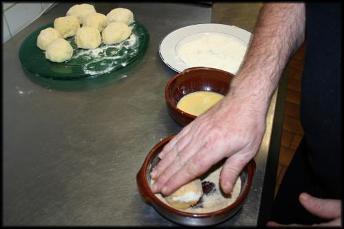 4. Rouler respectivement chaque croquette dans la farine, un jaune d'œuf, et ensuite dans la chapelure.