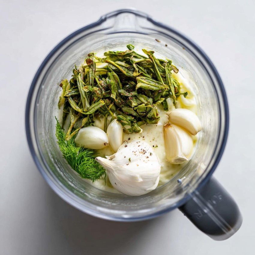 2 - Mixer dans le blender les bouquets de persil et d'aneth, avec une demi-échalote, une gousse d'ail, une pincée de sel, de poivre et 5 cl d'huile d'olive, puis mixer dans le blender jusqu'à l'obtention d'une crème onctueuse.