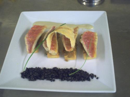 6. Pour le dressage, recouvrir chaque sablé de confits d'oignons, disposer les filets de rougets dessus, faire une tâche de sauce sur le côté et éventuellement sur les filets.