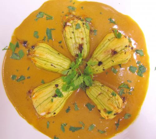 8 - A l'aide d'une poche à pâtisserie farcir les fleurs de courgettes (nettoyer et retirer pistil). Cuire au four les fleurs farcies dans la bisque pendant un quart d'heure à 160 degrés.