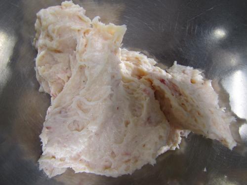 7 - Mixer au cutter la rascasse (sans peau, sans arrêtes) avec le beurre et le 100 g de crème liquide. Puis incorporer délicatement les blancs d'œufs