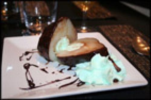 7. Avant de servir, remplir les poires froides avec la chantilly à la menthe et verser le chocolat chaud dessus.