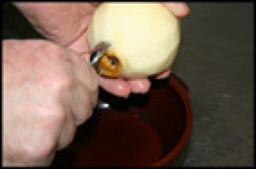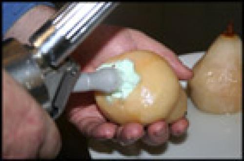 1. Eplucher les poires en gardant la queue et creuser l'intérieur des poires aux trois quart par le dessous à l'aide d'une cuillère à pomme parisienne et les réserver dans de l'eau avec un jus de citron.