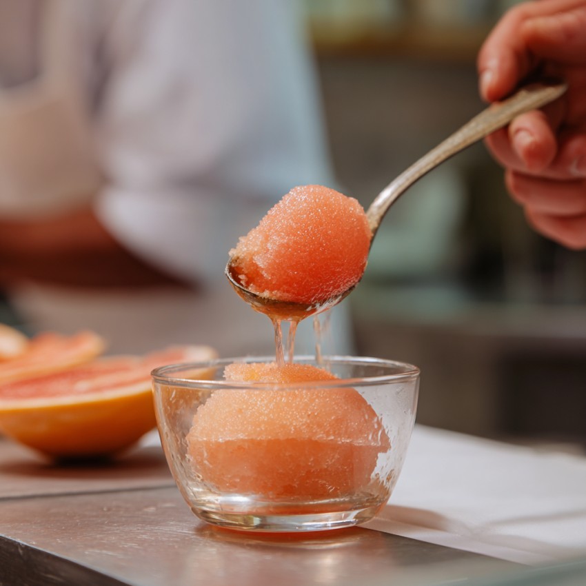3 - Pour le sorbet : Faire un sirop avec 175g d’eau, 200g de sucre, 4g de stabilisateur à glace et 75g de glucose déshydraté. Laisser refroidir et ajouter 700g de jus de pamplemousse et une pointe de colorant rouge. Passer en sorbetière.