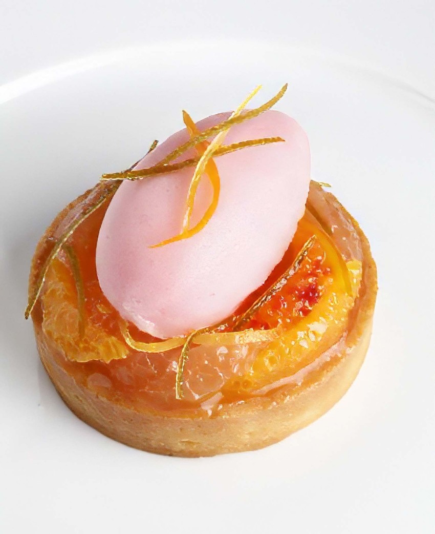 6 - Dressage : Prendre 3 oranges et 3 pamplemousses. Les peler à vif et prendre les segments. Les disposer sur la tartelette en forme de rosace. Décorer l’assiette avec le jus réduit. Poser la tartelette au centre en la collant avec un peu de miel. Déposer une quenelle de sorbet sur la tartelette et finir de décorer avec les zestes d’orange.