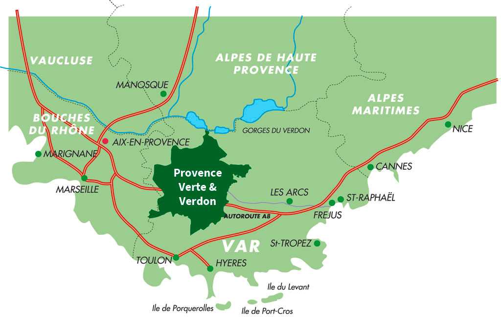 Le territoire de la Provence Verte & Verdon est idéalement situé au centre de la région Provence Alpes Côte d’Azur, à moins d’une heure de Marseille, Aix en Provence et Nice. Desservi par 2 sorties autoroute à Saint-Maximin et Brignoles, il est pratique d’accès.