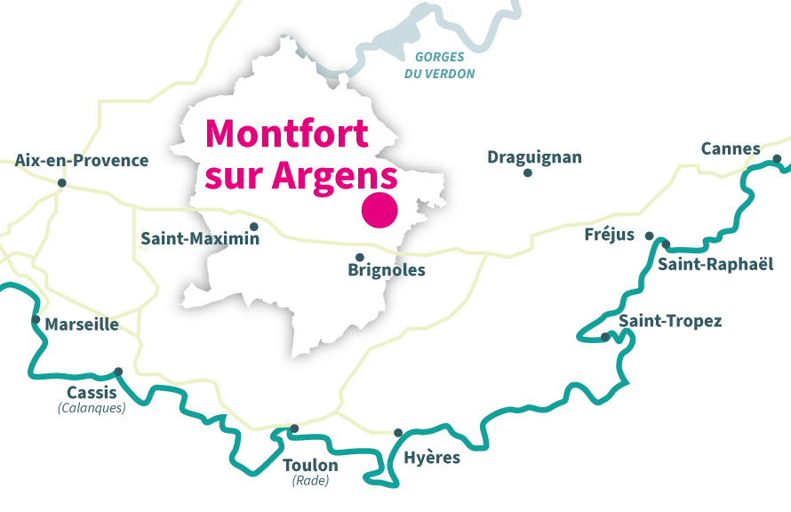 Adossé à la colline, et dominant la plaine, ce village, exposé plein sud, bénéficie d'un micro climat particulièrement agréable. Au pied de son château, ancienne commanderie templière, Montfort serpente à travers les ruelles en calades jusqu'aux rives de l'Argens. En bas, l'eau court encore à travers un canal qui se répand jusqu'aux jardins.