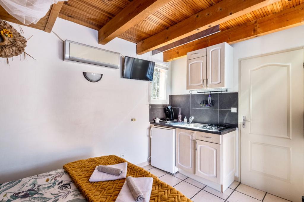 > Fidji : 20m², 1 lit double 160*200 + lit d'appoint BZ, kitchenette (induction, évier, micro ondes, vaisselle, frigo, cafetière, bouilloire), baies vitrées donnant sur la terrasse privative face à la piscine, télévision, climatisation et double vitrage, salle d'eau. Vue paradisiaque, calme assuré et nuits fraîches.