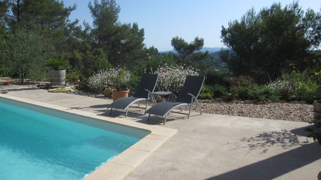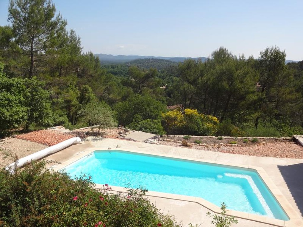 Maison avec piscine à 1,5 km du centre du village. Située sur une colline, sur 1.6 ha de jardin, vue surprenante et au calme.