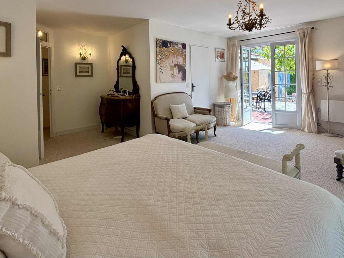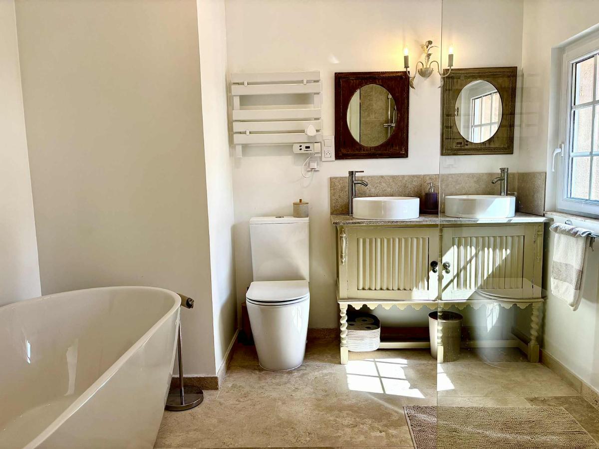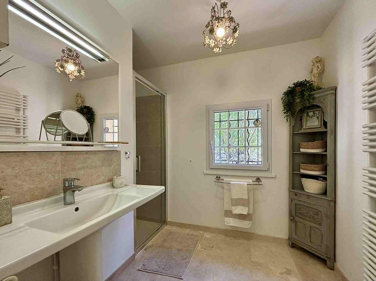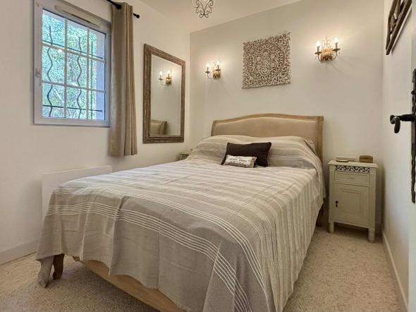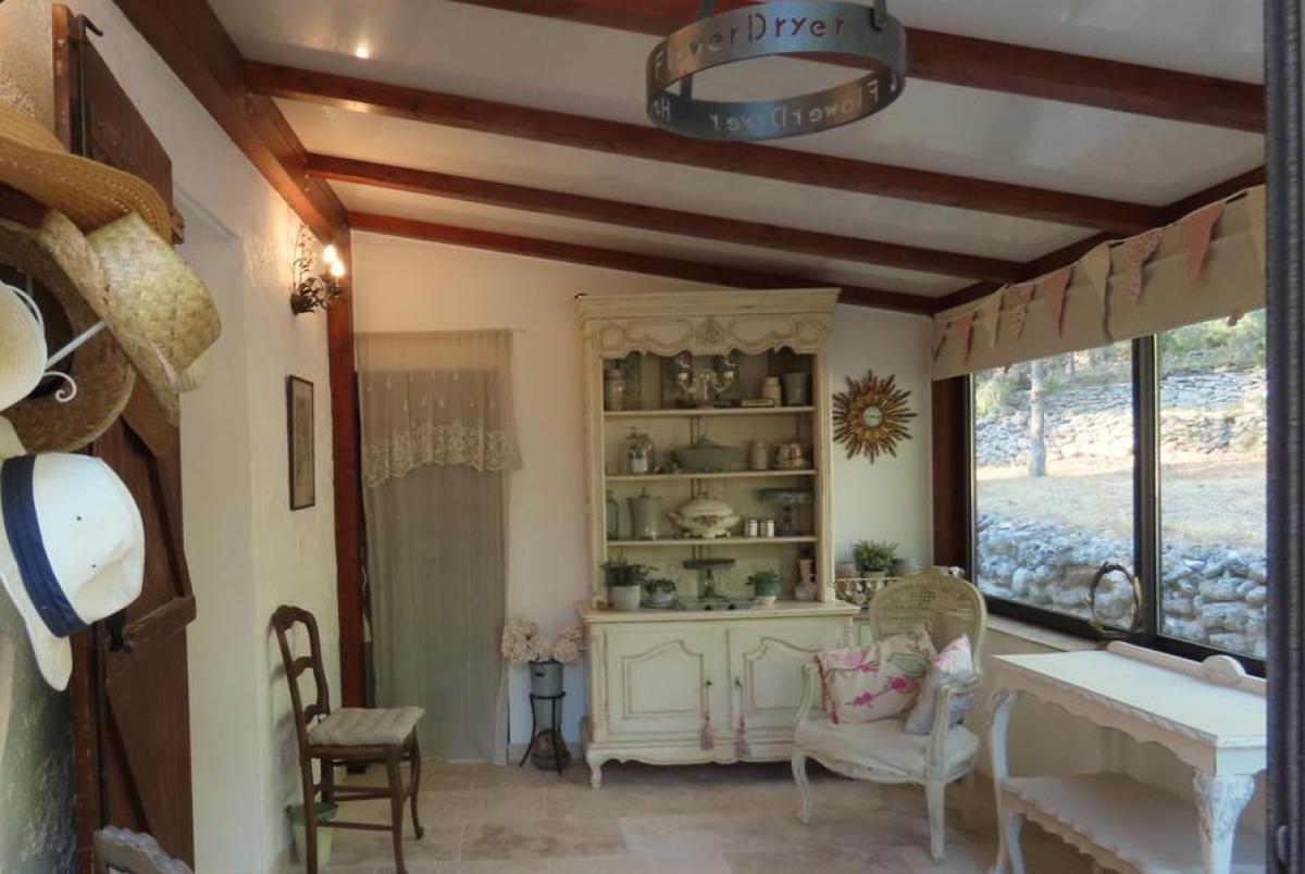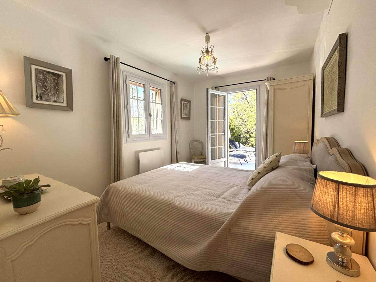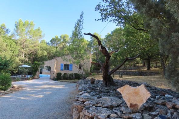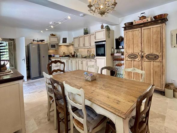 Maison indépendante plain-pied de 170 m² dans un jardin non-clôturé en restanques de 8000 m² avec piscine. Grande cuisine ouverte sur la terrasse, table pour 8 personnes.