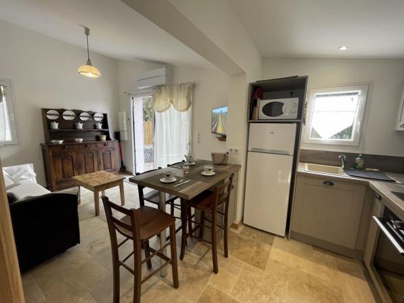 Maison mitoyenne de 30m² plain pied située en pleine campagne, sur une propriété clôturée de 6000 m², au calme. Animaux acceptés avec supplément.
