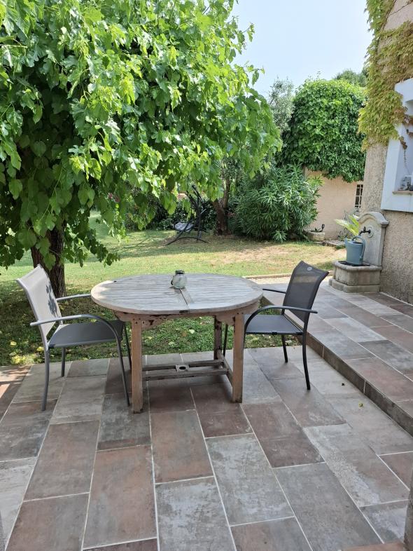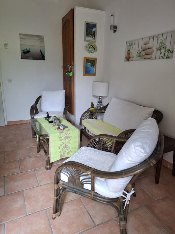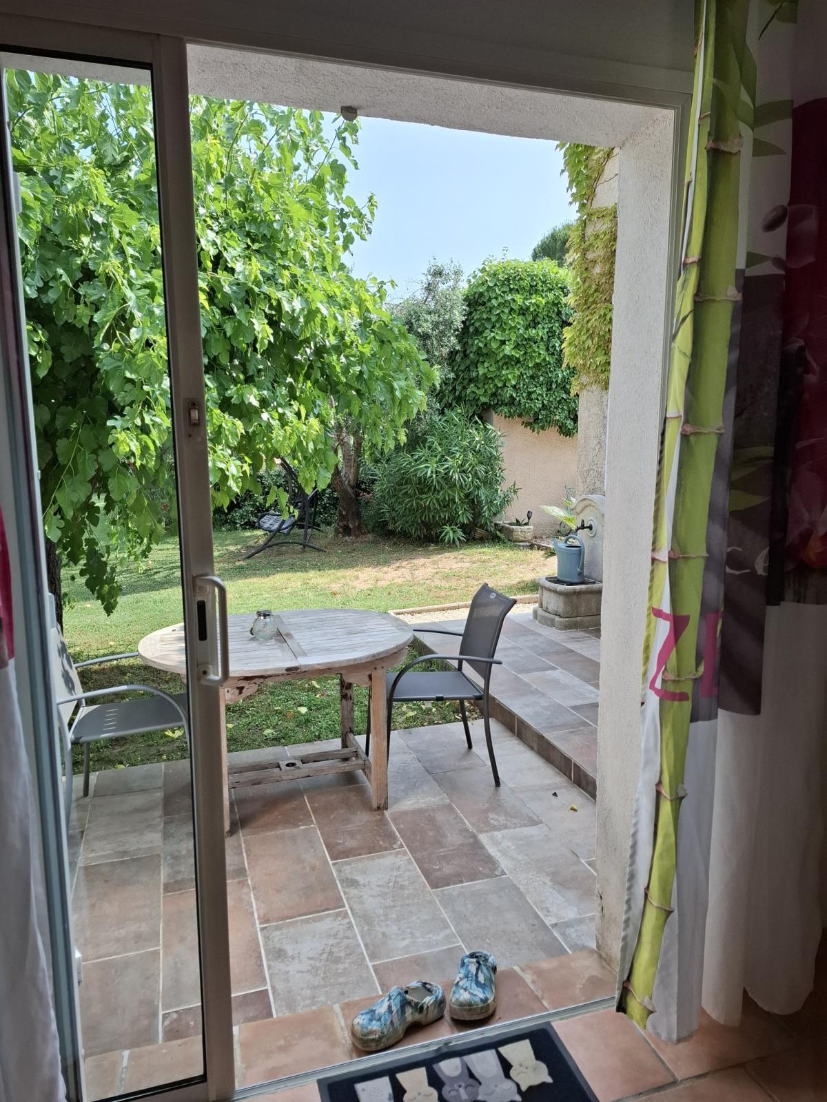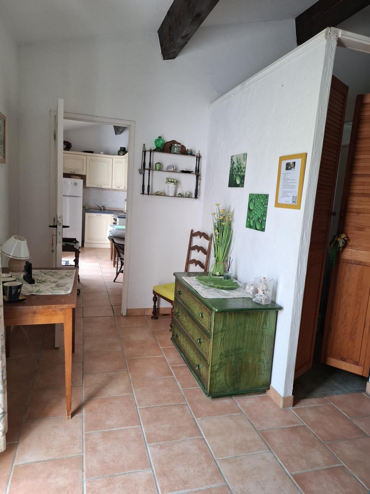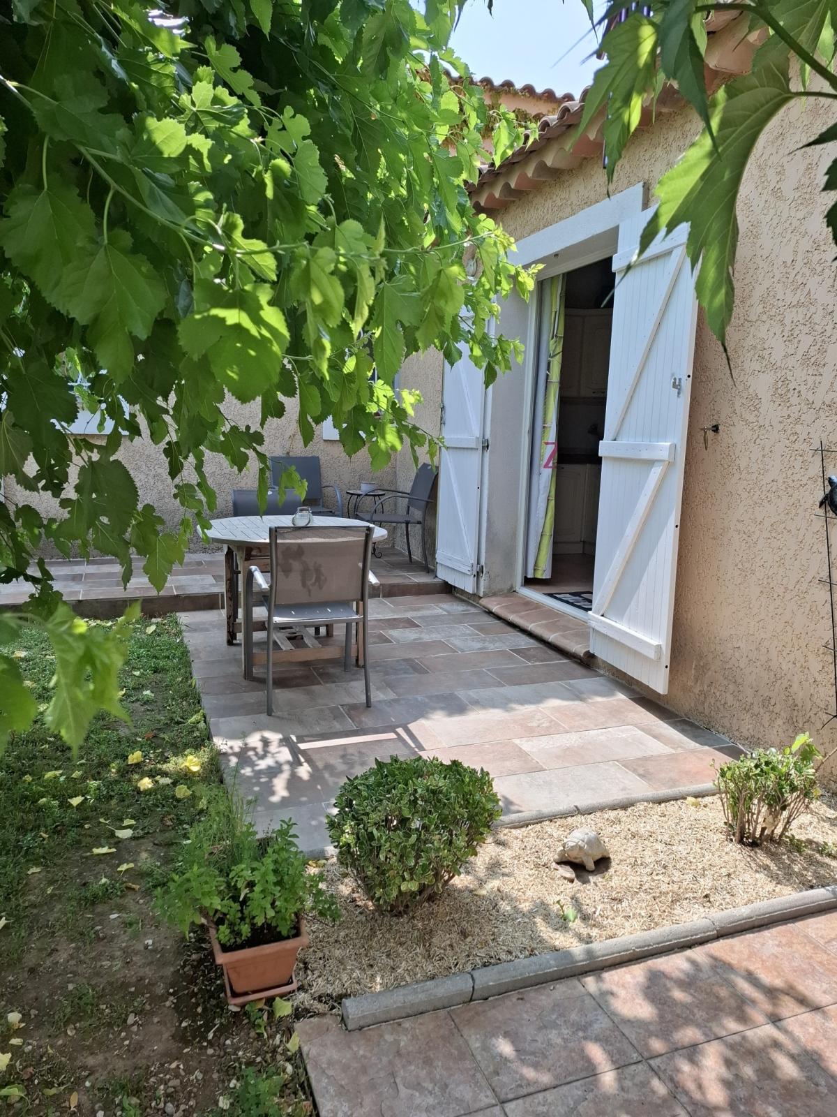 Appartement de plain pied de 40 m², mitoyen avec 2 autres locations, sur une propriété de 4500 m² clôturée. Terrain fleuri et arboré. Quartier au calme. À 5 minutes du village du Val à pied.