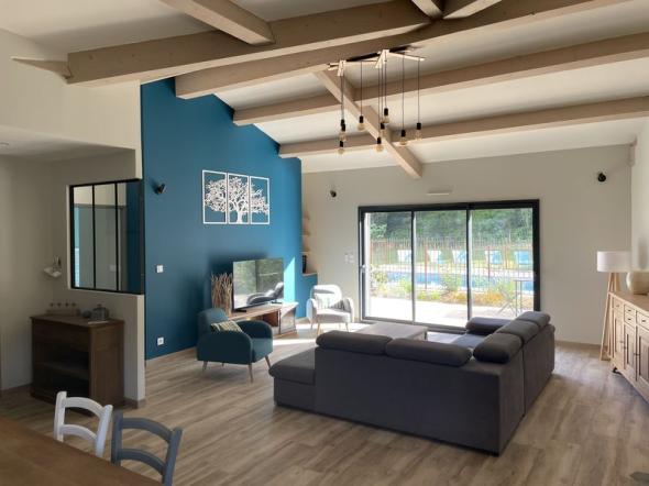 Maison climatisée, indépendante, de plain-pied située dans un quartier résidentiel, calme et à la campagne sur un parc de 1500 m² avec piscine privative. Tout confort, le Mas de Melna est un gîte contemporain idéalement situé.