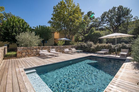 Villa de 140 m² au coeur d'un parc arboré de 90 hectares qui possède 3 suites avec salles de bain et toilettes privatives, jardin, barbecue, parking privé gratuit, vélos, piscine extérieure ouverte en saison et 2 terrains de pétanque.