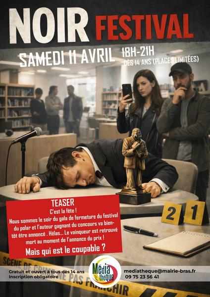 Soirée à thème : C'est la fête ! Nous sommes le soir du gala de fermeture du festival du polar et l'auteur gagnant du concours va bientôt être annoncé. Hélas... Le vainqueur est retrouvé mort au moment de l'annonce du prix ! Mais qui est le coupable ? Sur réservation !