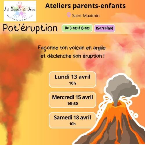 Initiation / découverte dans le cadre d'un événement : Façonnez votre propre volcan en argile lors d'un atelier modelage ludique et créatif. Apprends les secrets du dosage entre bicarbonate et vinaigre pour provoquer l'éruption. Ateliers parents/enfants organisés par La Bande à Jenn. Enfant de 3 à 8 ans.