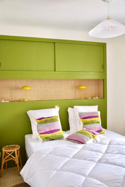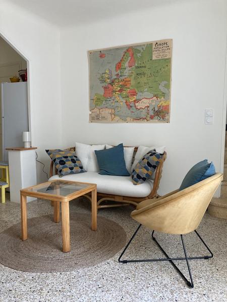 Vous disposez d’un séjour/cuisine en Rez-de-jardin et de 2 chambres au 1er étage. Une chambre de 13m² avec vue sur le jardin et une chambre de 8,5m² sur rue (ventilateur sur pied dans les chambres).