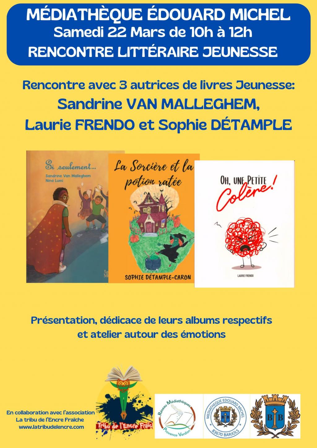 “ En collaboration avec la tribu de l'encre fraiche rencontrez : Sandrine VAN MALLEGHEM , Laurie FRENDO, Sophie DÉTAMPLE. Présentation et dédicace de leurs albums ainsi que des ateliers autour des émotions seront proposées. ”