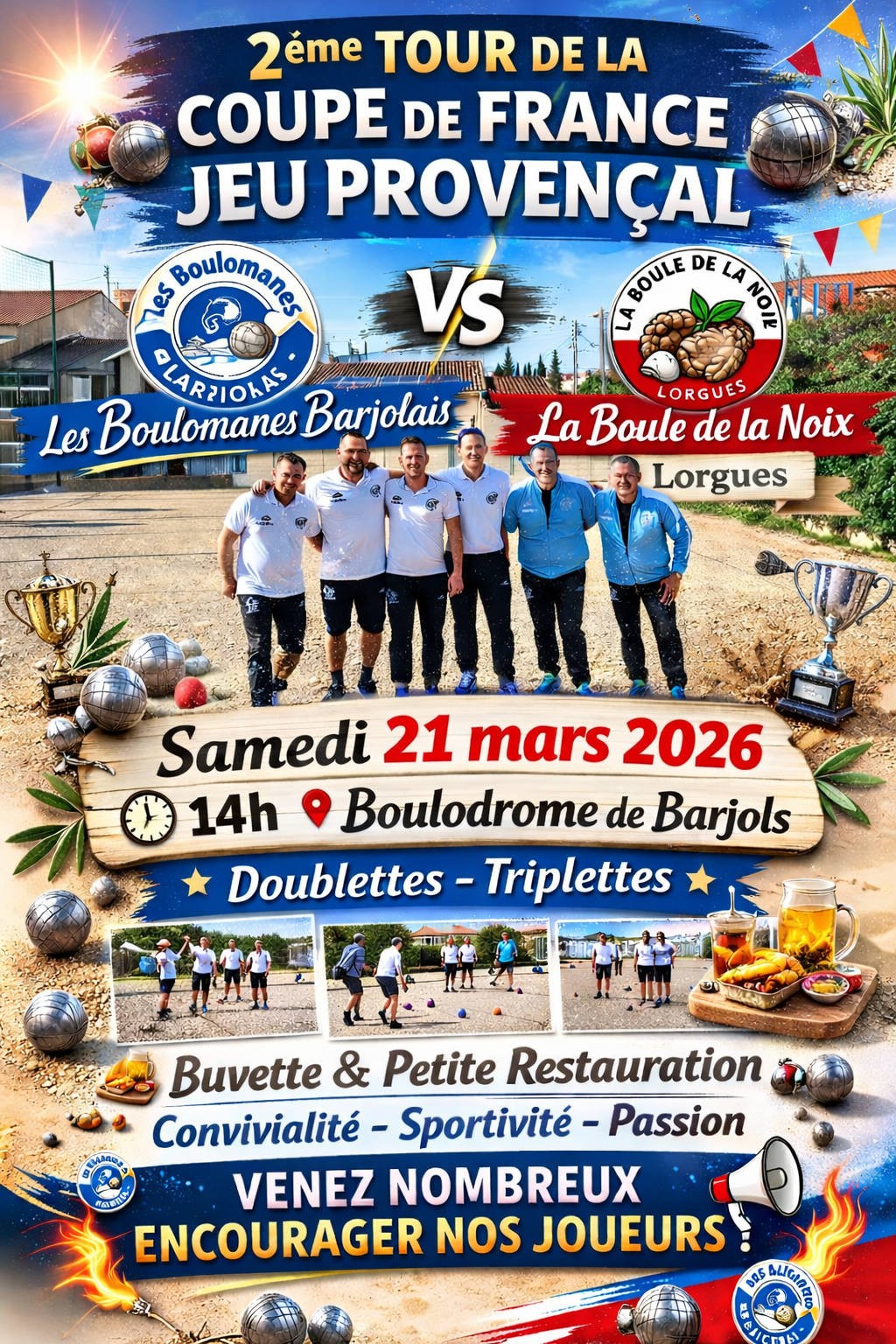 “ 2eme tour de la coupe de France au jeu provençal pour les boulomanes barjolais contre la boule de la noix de Lorgues. Venez nombreux les encourager. Petite restauration et buvette sur place. ”