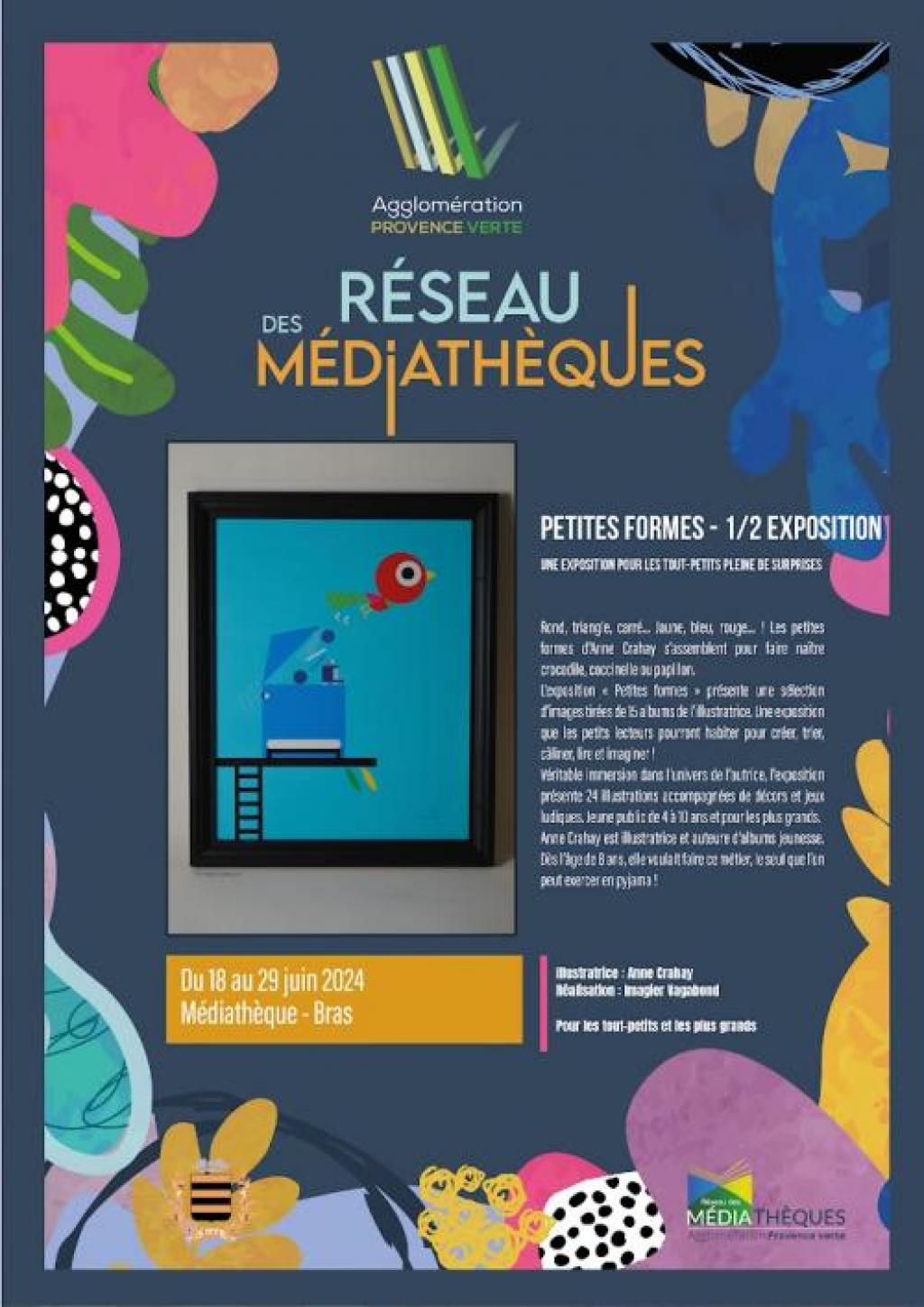 “ Une exposition d'illustrations de l'artiste, avec un espace tout en bois construit par elle à hauteur d'enfants. Un lieu à laisser habiter par les petits lecteurs pour créer, trier, câliner, lire et imaginer ”