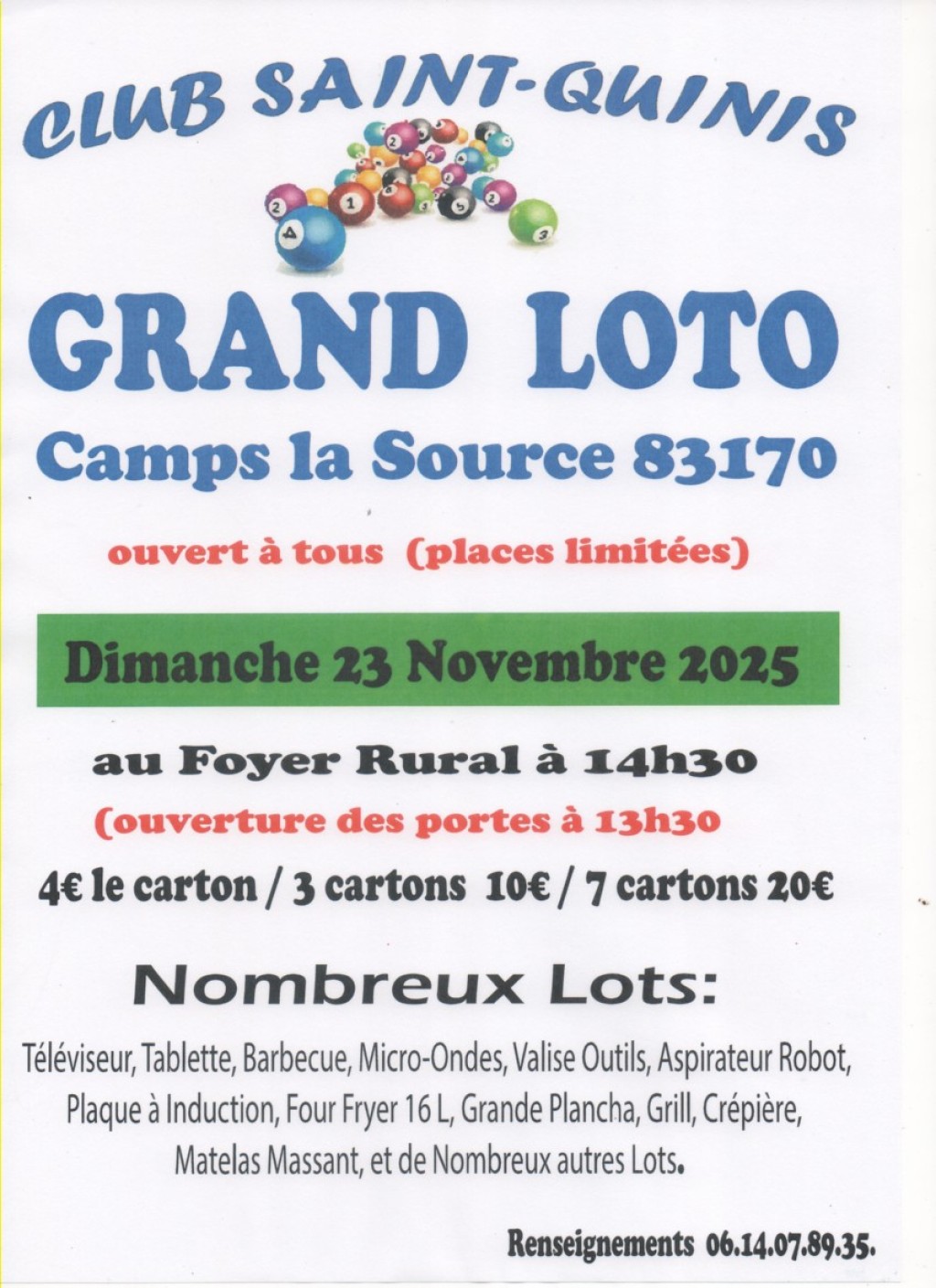 < Le carton : 4 €| Les 3 cartons : 10 € | les 7 cartons : 20 €.