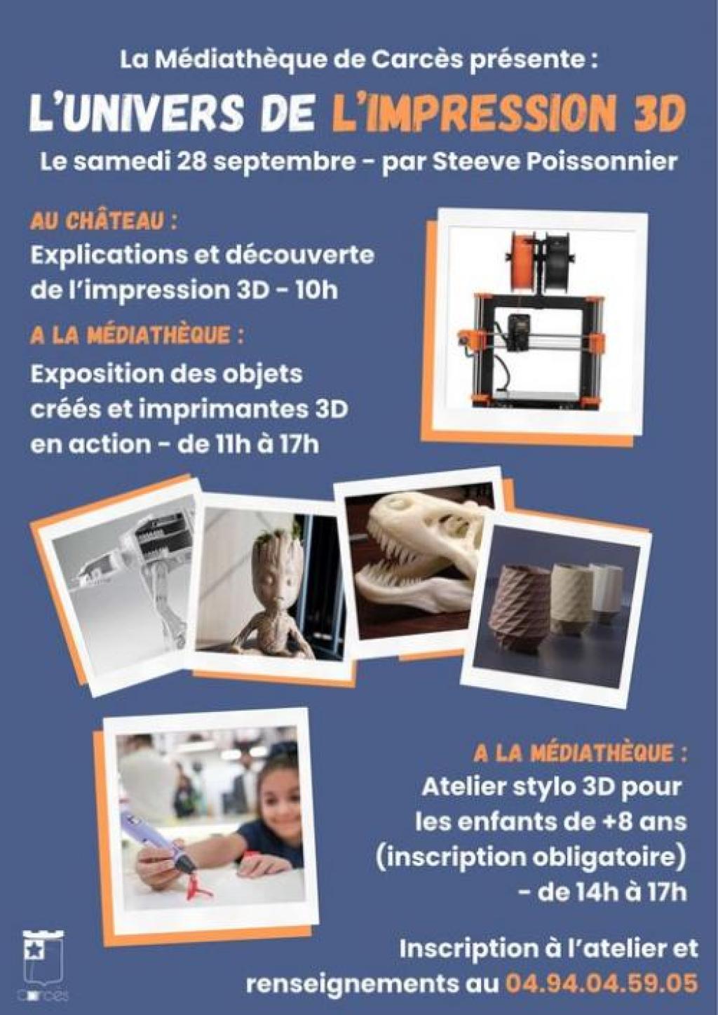 “ Découvrez le monde de l'impression 3D avec Steeve Poissonnier. Entre exposition et atelier, un atelier stylo 3D (à partir de 8 ans sur inscription) ”