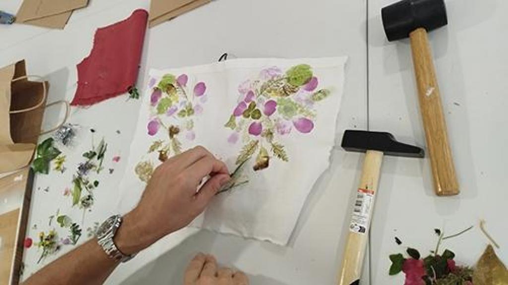“ Le tataki zomé est une technique qui consiste à imprimer du tissus en martelant des végétaux fraichement cueillis dans le jardin de sculpture du centre d'art. Ceci pouvant être bruyant, pensez à prendre des boulles quies ”