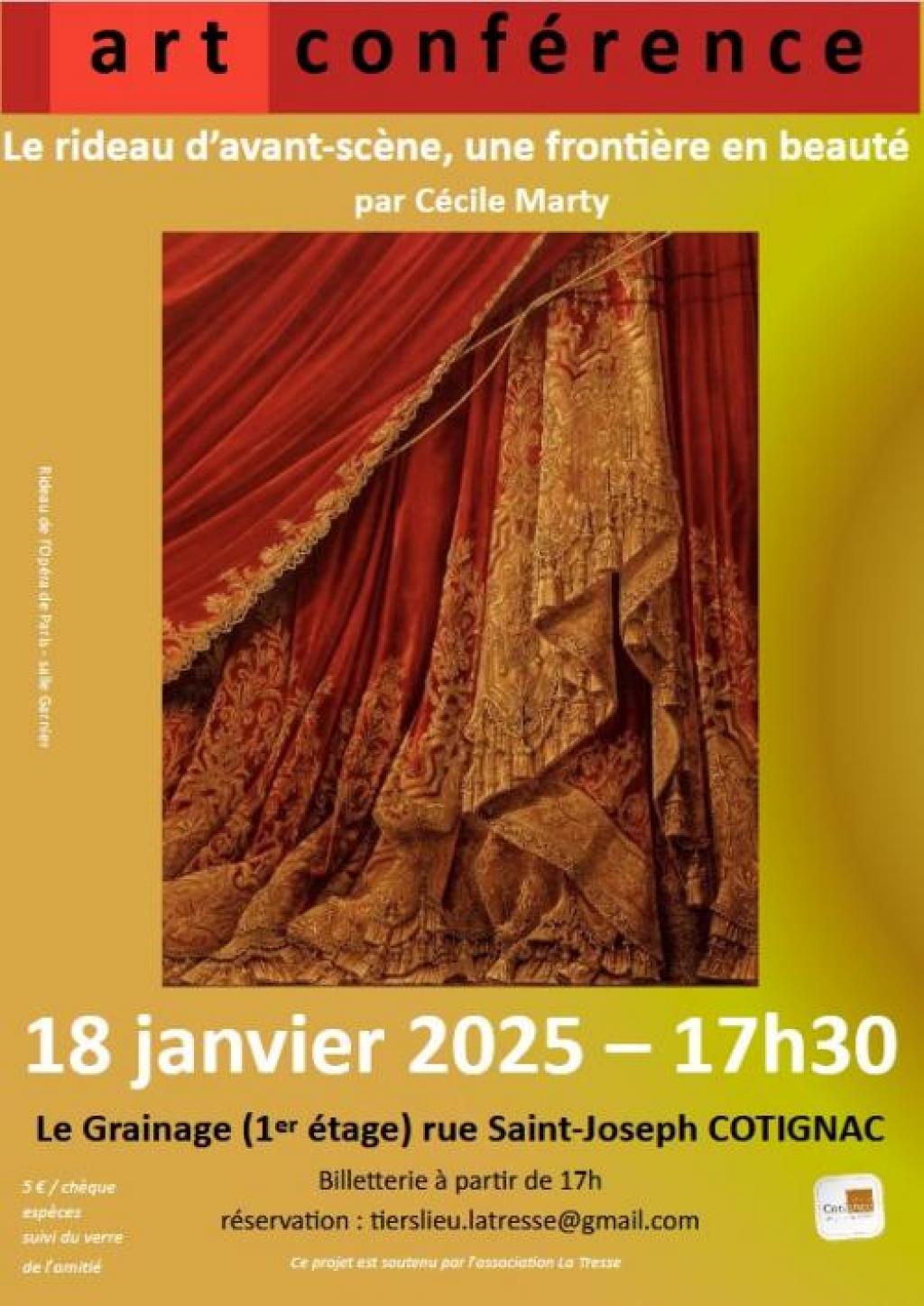 “ La première soirée du 4ème cycle d'Art Conférences sera animée par Cécile Marty. Passionnée par les arts de la scène, elle abordera le rideau d'avant-scène, situé entre 2 arts : la peinture et le théâtre, à la fois motif plastique et outil scénographique. ”