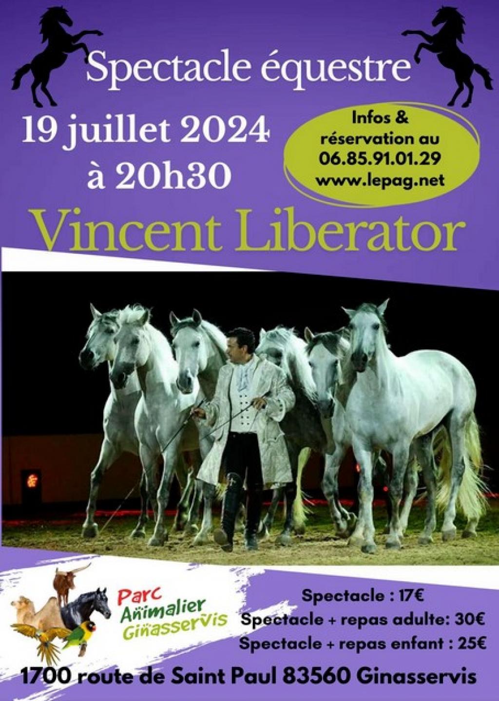 “ Venez assister au spectacle équestre mené par Vincent Liberator, un artiste équestre depuis 1998 qui a remporté de nombreux palmarès à travers l'Europe. Vivez un moment exceptionnel de grande complicité et de confiance entre Vincent et ses chevaux. ”