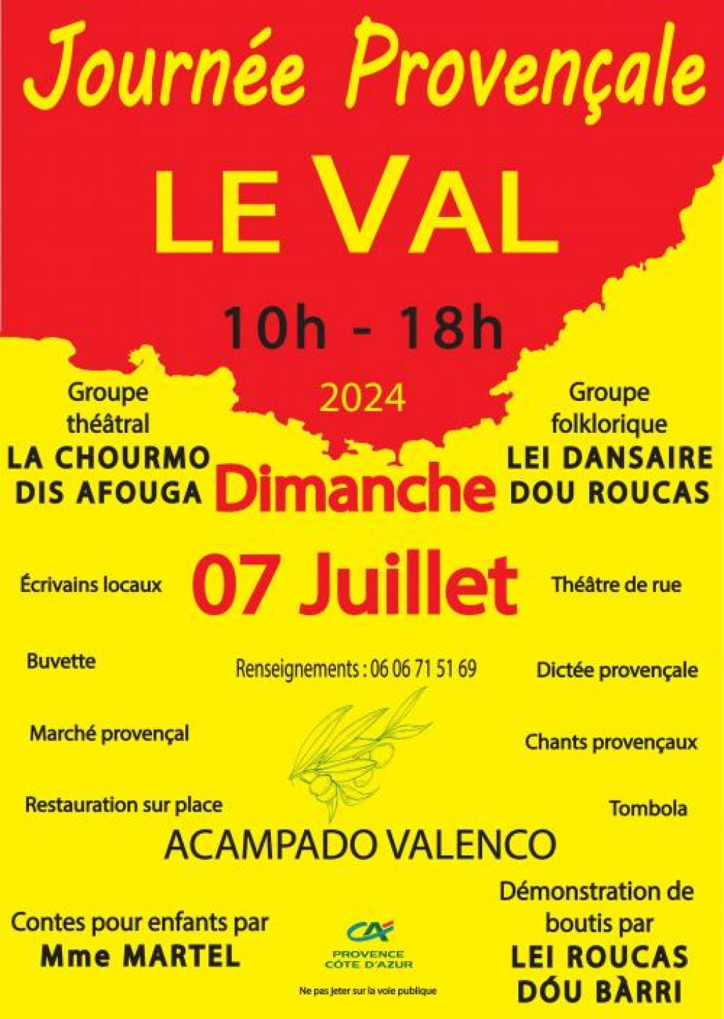 “ participez à la journée provençale de l'acampado valenco, Théâtre de rue ,Groupe folklorique, Ecrivains locaux, Dictée provençale, Chants locaux, Marché provençal et Tombola au programme ”