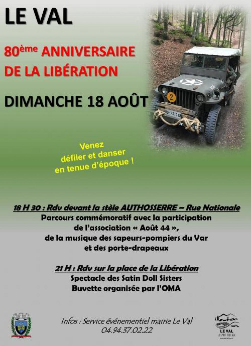 “ Parcours commémoratif, Dépôts de gerbes, Défilé de véhicules militaires d'époque et de la Musique des Sapeurs-Pompiers du Var, Animation musicale en soirée. Venez défiler et danser en tenue d'époque ”