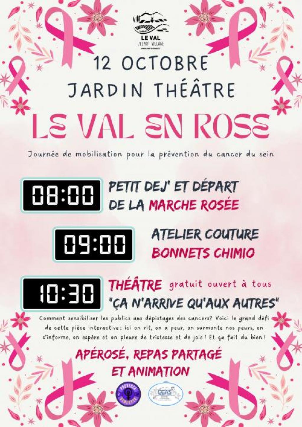 “ Après la marche rose, un atelier couture (bonnets chimio) vous sera proposé, suivi d'une pièce de théâtre 'ça n'arrive qu'aux autres' (ouvert à tous). Apérosé, repas partagé et diverses animations concluront cette journée. ”