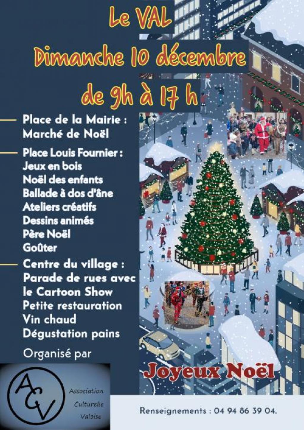 “ Marché de Noël, atelier créatifs, dessins animés, ballade à dos d'âne, jeux en bois, Père Noël, goûter et parade de rues, vin chaud, dégustation de pains ”