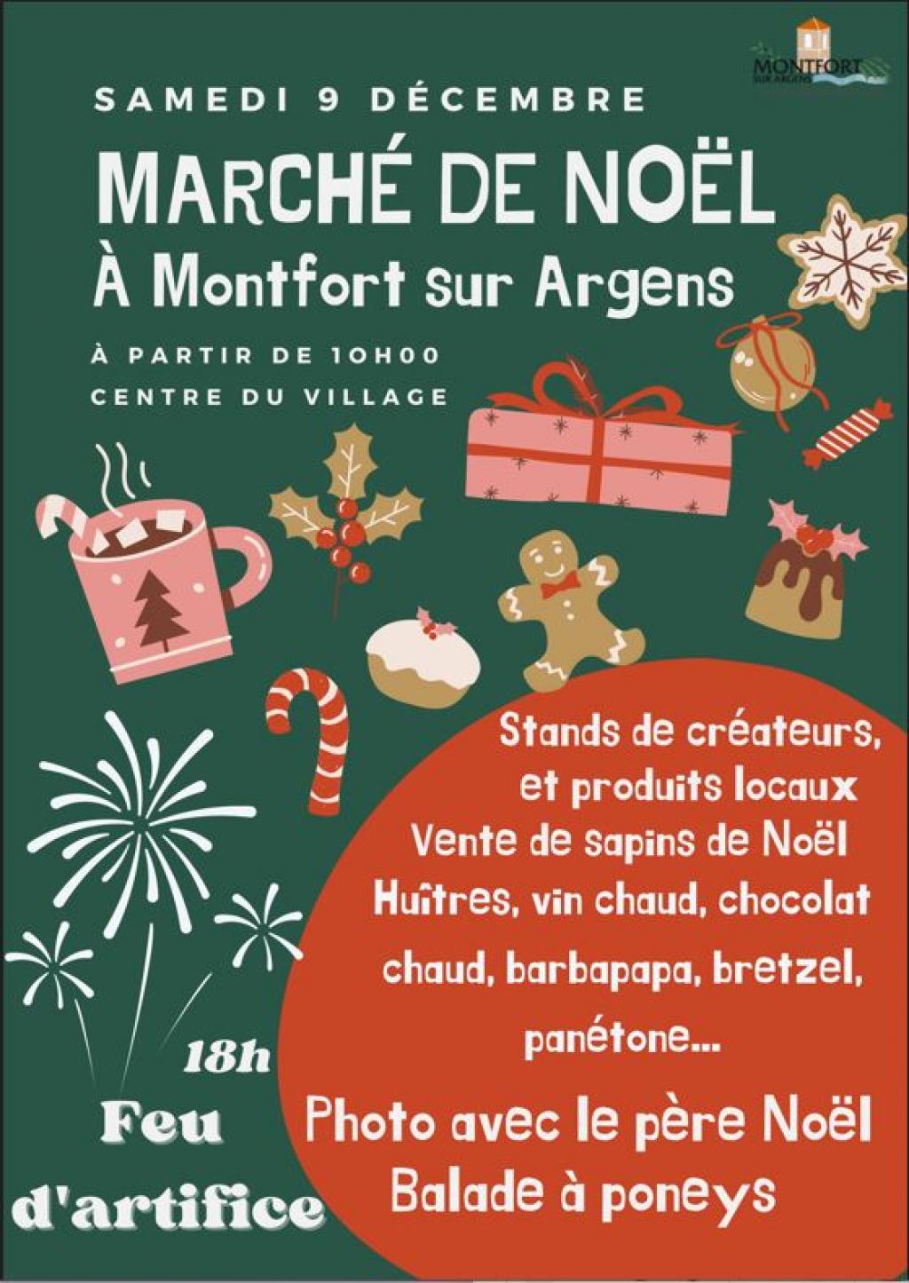 “ Stands de créateurs et produits locaux. Vente de sapins de Noël, huitres, vin chaud, chocolat chaud, … Photos avec le Père Noël et balade à poneys ”