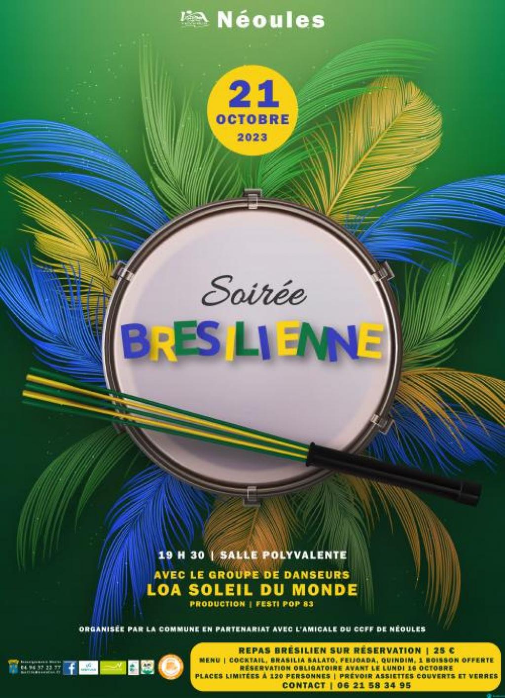 “ La commune de Néoules organise, en partenariat avec l'Amicale CCFF Neoules, une soirée brésilienne colorée et rythmée avec la Troupe de danseurs Loa Soleil du Monde . Une production Dimitry Festi Pop. ”