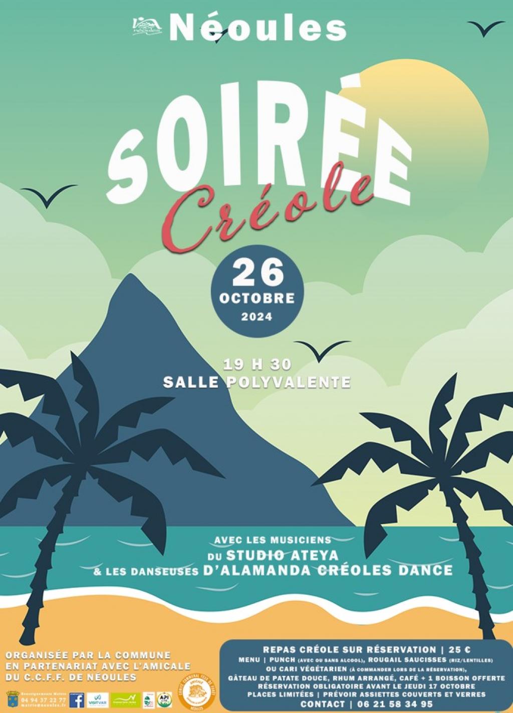 “ L'amicale du C.C.F.F., en partenariat avec la commune, vous propose de passer une magnifique soirée sous le signe de la convivialité et de la chaleur réunionnaise, accompagnée des musiciens du studio Ateya et des danseuses d'Alamanda créoles dance ! ”