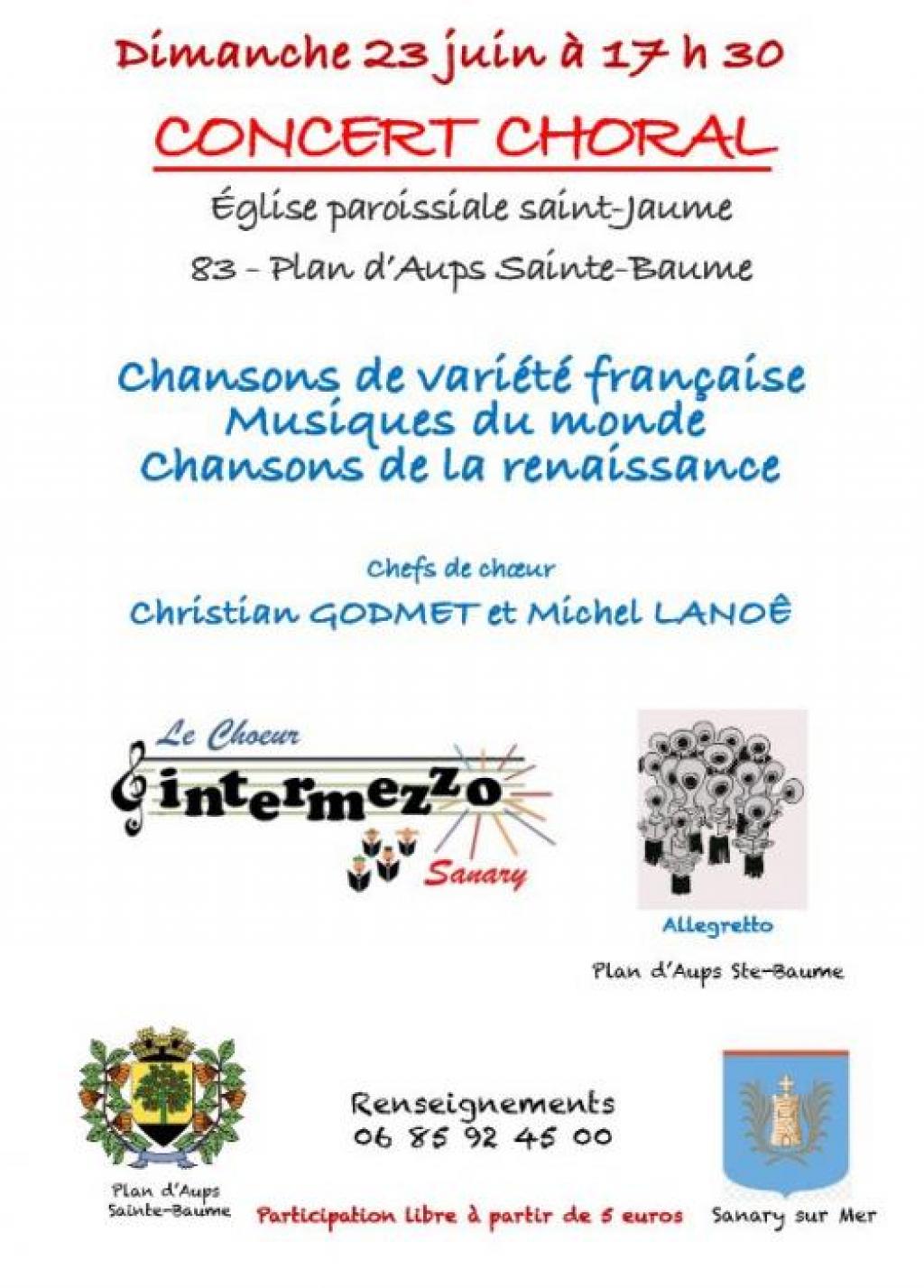 “ La chorale Intermezzo de Sanary avec son chef de choeur Christian Godmet et la chorale Allegretto du Plan d'Aups avec son chef de choeur Miche Lanoê ont le plaisir de vous inviter à leur concert. ”