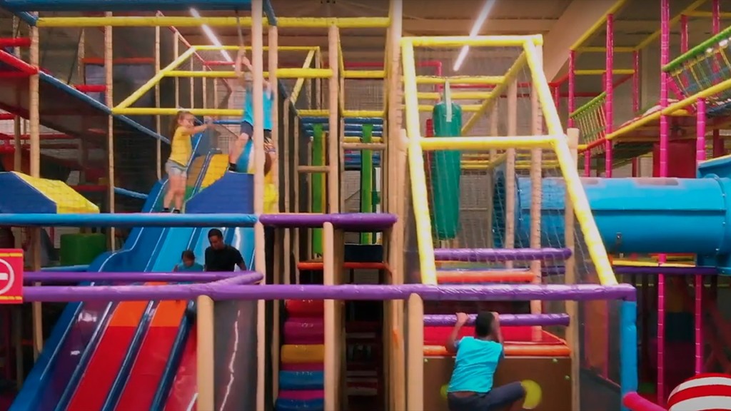 Un espace de jeux avec toboggans, piste de luge, ponts de singe, Legos géants, piste de motos électriques, piscine à balles, tyrolienne, tourniquet...