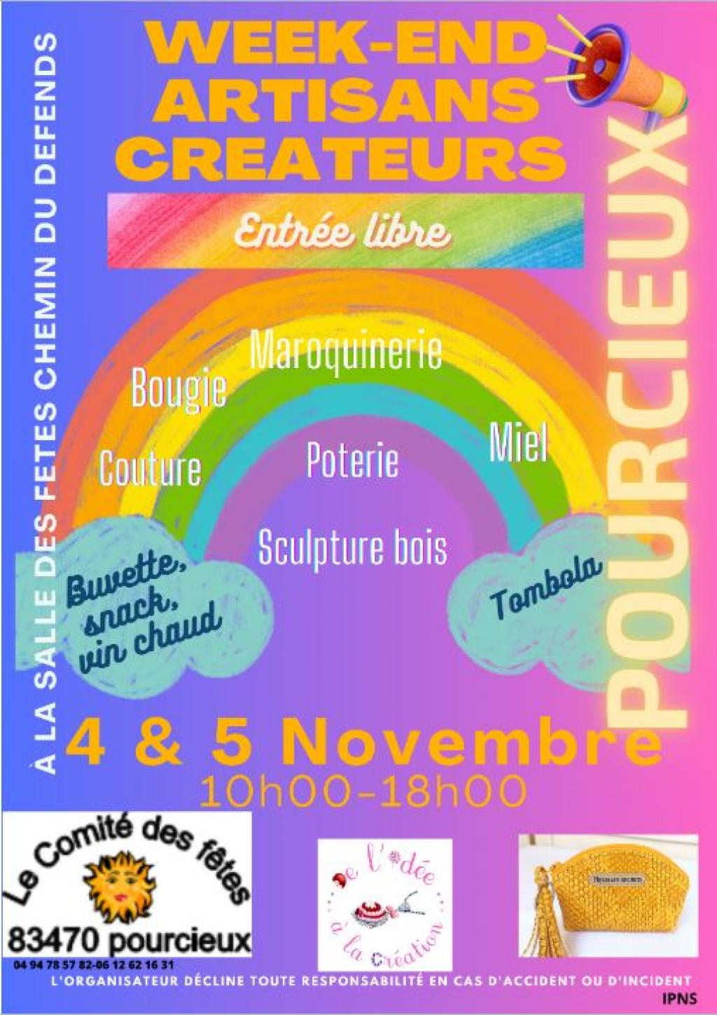 “ De nombreux artisans créateurs seront présents : maroquinerie, bougie, couture, poterie, sculpture sur bois, miel. Buvette, snack et vin chaud. Tombola. ”