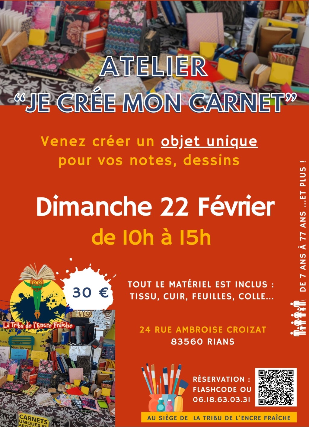 Cet atelier est animé par Philippe Laprade, artiste et art-thérapeute, il vous accompagnera pour créer votre propre carnet à écrire ou dessiner, au format que vous désirez (A4, A5, A6...) et avec tous les matériaux qui seront mis à votre disposition : papier, tissu, cuir, ficelle, bouton, coton, carton... Créez > Emportez !