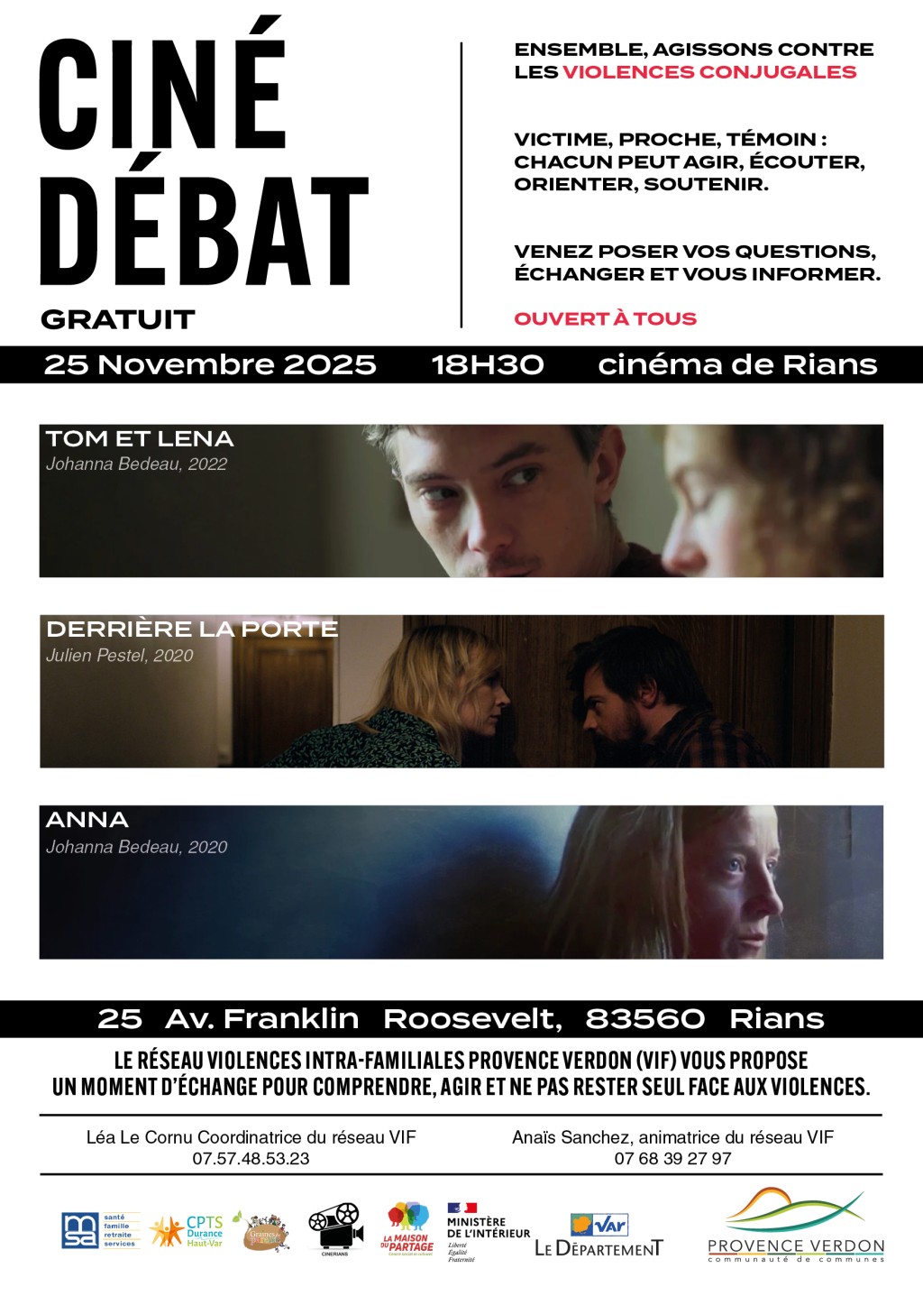 Elle sera suivie d'un échange avec les acteurs locaux impliqués dans la prévention et la prise en charge des situations de violences conjugales : L'UTS Provence Verte Cœur du Var, la brigade de gendarmerie de Rians, la CPTS Durance Haut Var, l'association Graines de Parents, le centre social et culturel la Maison du Partage, le service prévention de la Communauté de communes Provence Verdon.
