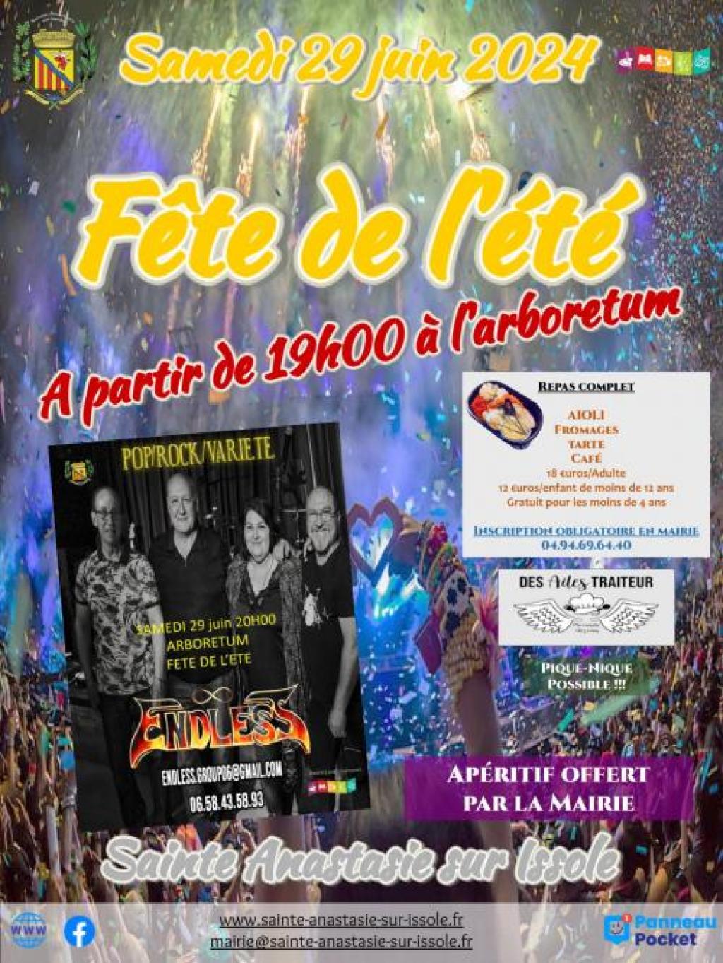 “ Apéritif offert par la mairie., suivi d'un concert pop rock variétés du groupe Endless. Un repas Aïoli vous sera proposé. Pique nique possible. Buvette et petite restauration sur place. ”