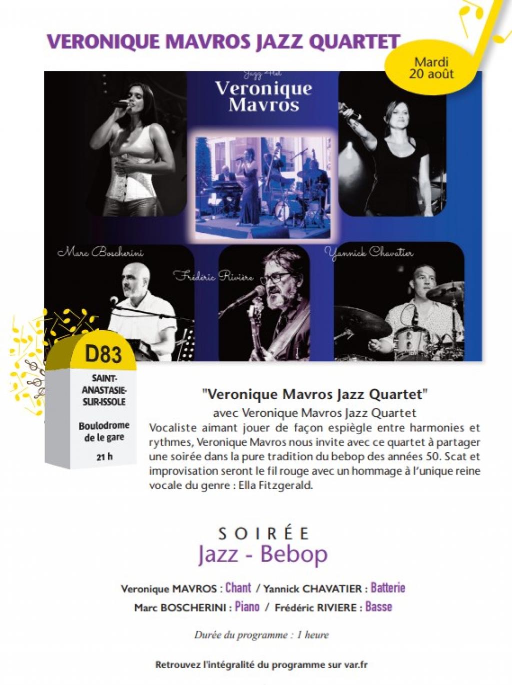 “ Vocaliste aimant jouer de façon espiègle entre harmonies et rythmes, Véronique Mavros invite le public à partager, avec ce quartet, une soirée dans la pure tradition du bebop des années 50. ”